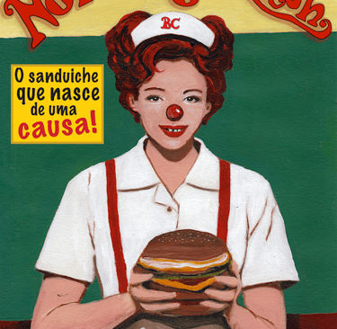 A obra Big Clash nos apresenta uma atendente de lanchonete inserida em um universo de cores saturadas e uma atmosfera POP, convidando-nos a refletir sobre o consumo e a dissonância entre o prometido e o real. Seu uniforme vintage, com linhas simples e atemporais, evoca uma sensação de nostalgia e confiança, remetendo à ideia de um passado idealizado. No entanto, o sorriso enigmático da atendente – simultaneamente pueril e diabólico – subverte essa sensação, transformando-a em uma provocação. O nariz vermelho de palhaço e a falta de um dente ampliam essa ambiguidade, sugerindo que, por trás da fachada acolhedora e da promessa de prazer imediato, há algo dissonante, talvez perturbador, que escapa à percepção superficial. O hambúrguer que ela segura com cuidado e destaque, descrito no conto como uma "obra-prima da gastronomia", transforma-se em um símbolo de promessas vazias. A experiência de consumo, que deveria ser única e autêntica, revela-se uma reedição repetitiva e medíocre de algo já desgastado. A frase publicitária “o sanduíche que nasce de uma causa!” acrescenta ironia ao contexto, aludindo ao uso recorrente do marketing emocional para mascarar a banalidade do produto. Assim, o trabalho expõe como somos conduzidos, como parte de uma manada, a desejar aquilo que nos é imposto, muitas vezes sem questionar as narrativas que consumimos – e que nos consomem. O conto criado em conjunto com a obra amplia essa reflexão, conduzindo-nos por um processo de alienação e frustração que permeia o ato de consumir. Big Clash nos coloca diante da contradição central do consumo e do entretenimento contemporâneo: alimentado pela promessa de inovação, mas oferecendo apenas o repetido, o superficial, o vazio. Mais que isso, nos força a encarar essas narrativas de espetáculo e consumo com um olhar crítico, questionando não apenas aquilo que desejamos, mas também como esse desejo é fabricado e direcionado. Em uma sociedade onde a propaganda frequentemente se sobrepõe à verdade, o trabalho de Anuk Vardan desafia-nos a distinguir entre o que é real e autêntico e o que é imposto como tal.