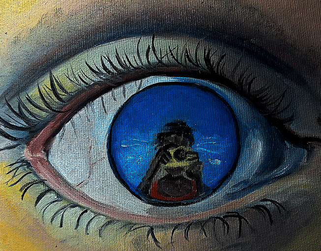 A obra "Olho no Olho" explora as zonas liminares entre o visível e o oculto, expandindo o conceito central da série Infiltração. Partindo da ideia de certos movimentos adentram de forma sutil em estruturas sólidas, essa obra evoca os sentidos de termos análogos à infiltração, como ‘mergulhar’ e ‘encharcar’. A menina que mergulha e fotografa, refletida nos olhos de outra pessoa, é parte daquilo que que vê. Essa abordagem reforça a essência da série, propondo uma reflexão sobre aquilo que permeia e transforma de forma quase imperceptível.